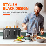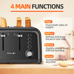 - STAINLESS STEEL 4 SLICE TOASTER - This stylish and efficient brushed stainless steel toaster has 4 extra wide toasting slots(1.45" x 5.43") to perfectly toast bread, both halves of bagels, and more.
